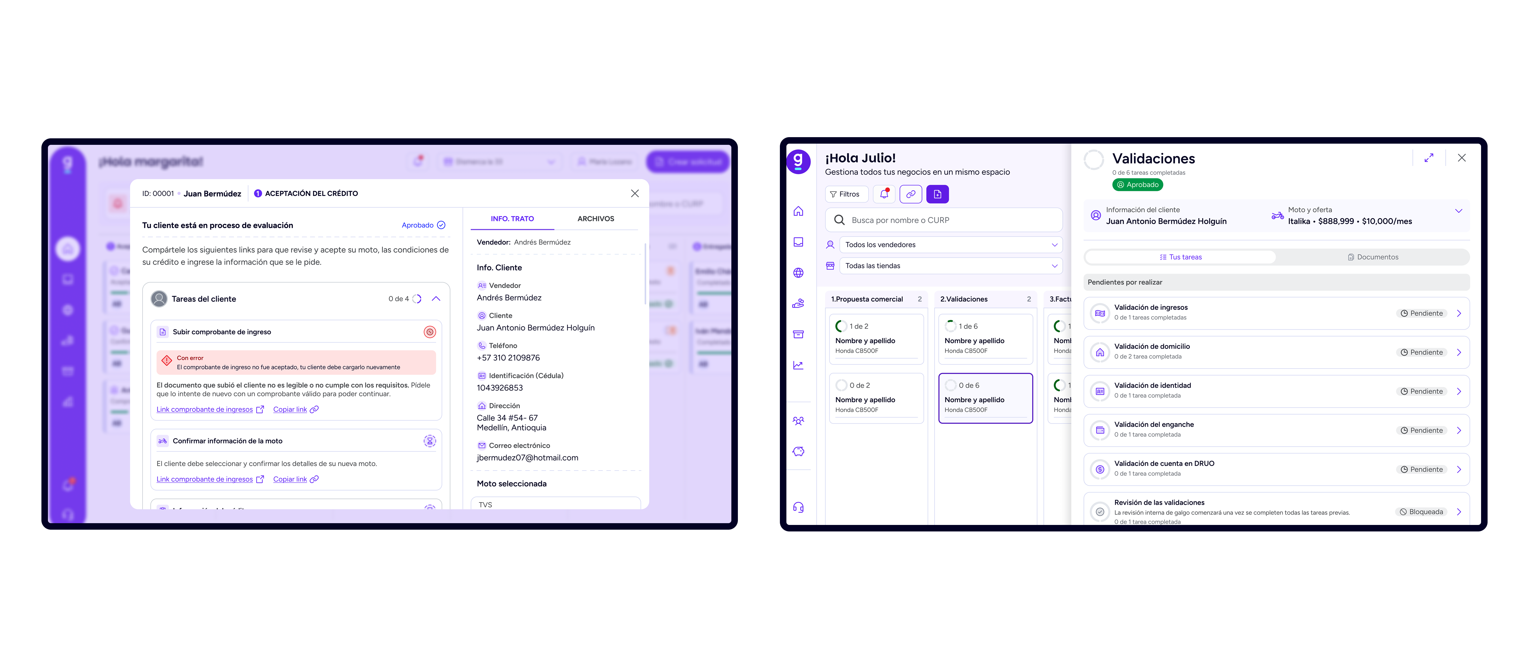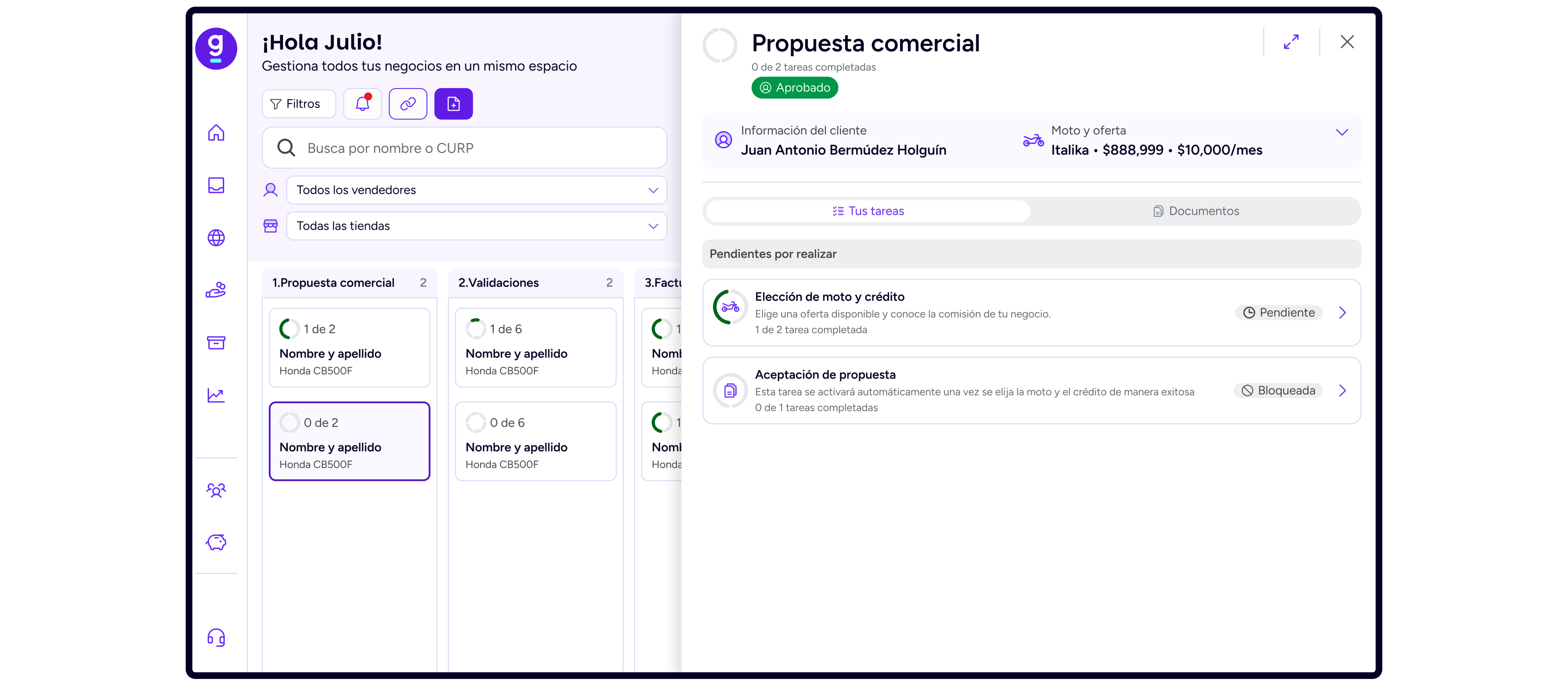 En esta primera etapa defines la moto y el plan de crédito que mejor se adapta al cliente, y le presentas la propuesta para que la acepte. Consta de 2 tareas.