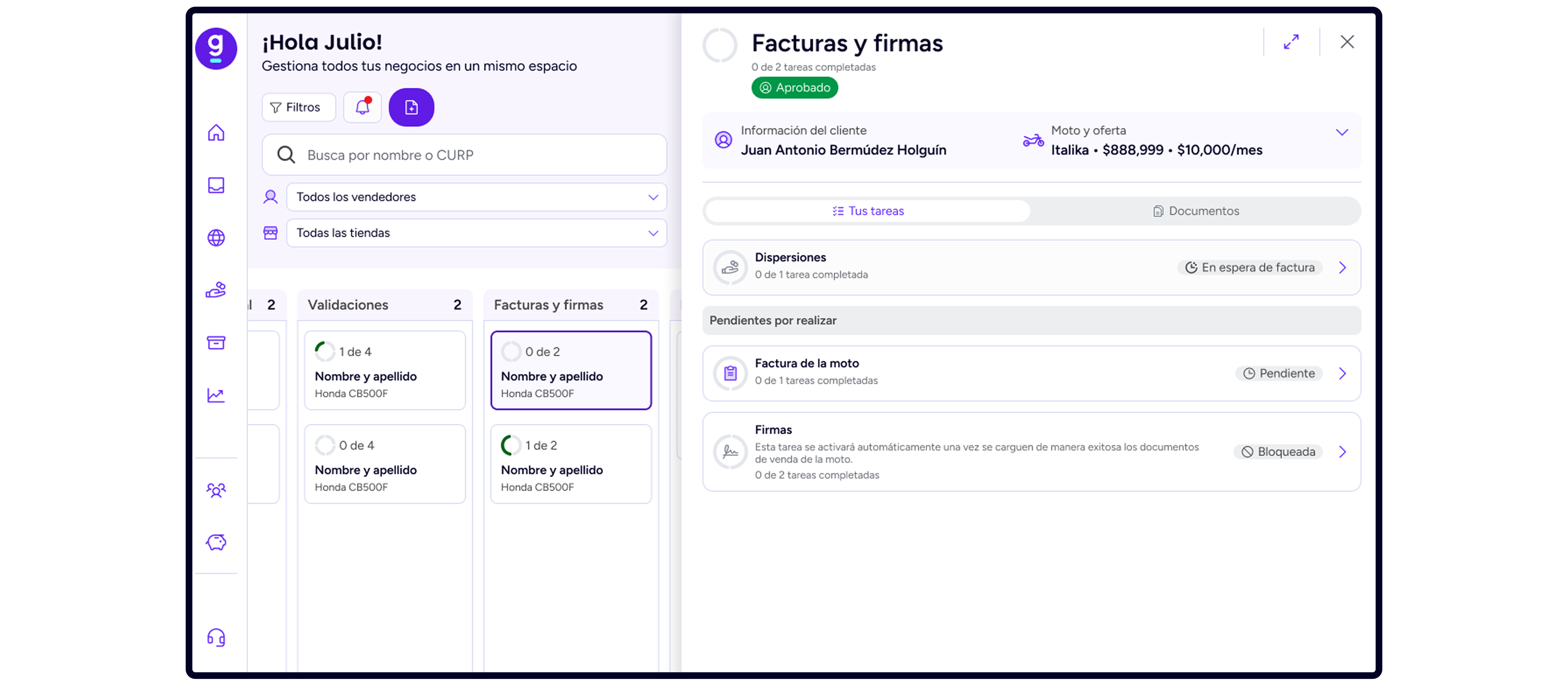Ahora, al dar clic en cualquier tarjeta del tablero se despliega un panel lateral amplio y organizado, que convive con el tablero. Puedes ver el detalle de tu negocio sin perder de vista los demás.