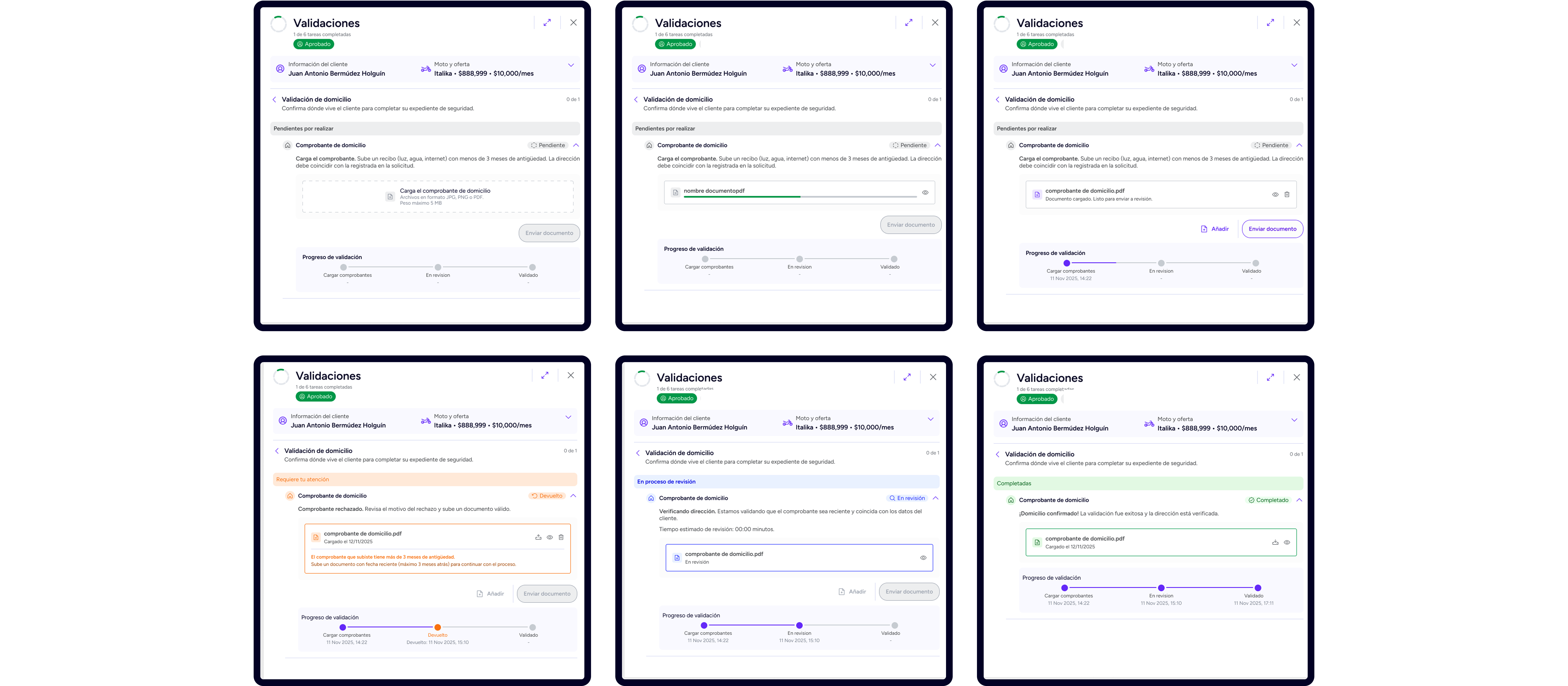 En esta etapa se validan los documentos e información del cliente para continuar con el proceso. Consta de 6 tareas, cada una con su propio flujo y estados de progreso.